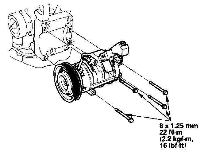 8. Remove the mounting bolts and the compressor. Be careful not to damage the radiator fins when removing the compressor.