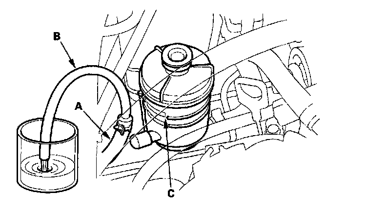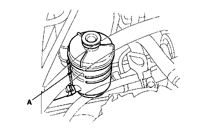 1. Remove the power steering reservoir from its holder. Raise the reservoir, then disconnect the return hose (A) to drain the reservoir. Take care not to spill the fluid on the body and parts. Wipe off any spilled fluid at once.