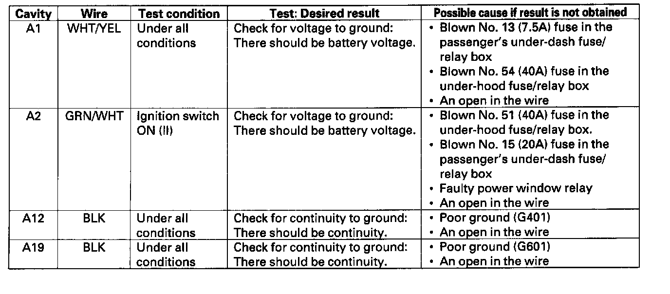 10. Make the following input tests at 22P connector B and the driver's under-dash fuse/relay box socket.