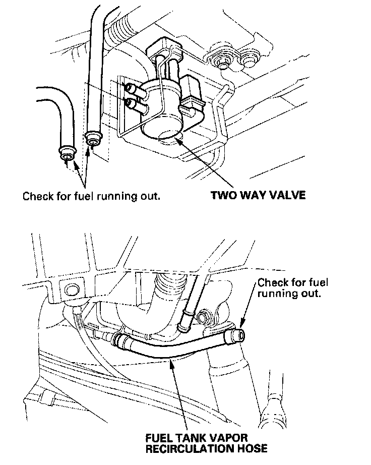 - If fuel runs out of the hoses at either location, replace the fuel tank vapor control valve.