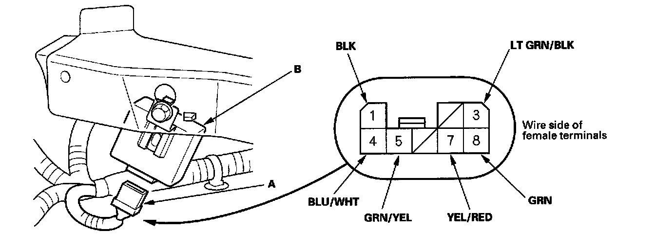 2. Disconnect the 8P connector (A) from the rear window wiper intermittent control unit (B).