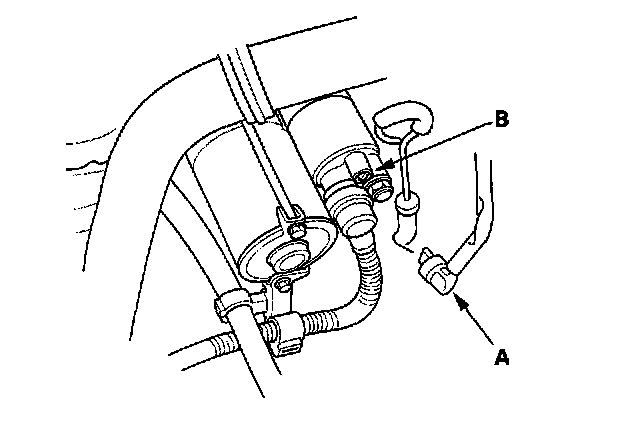 5. Make sure the transmission is in Park or Neutral, then disconnect the BLK/WHT wire (A) from the starter solenoid (B). Connect a jumper wire from the battery positive terminal to the solenoid terminal.