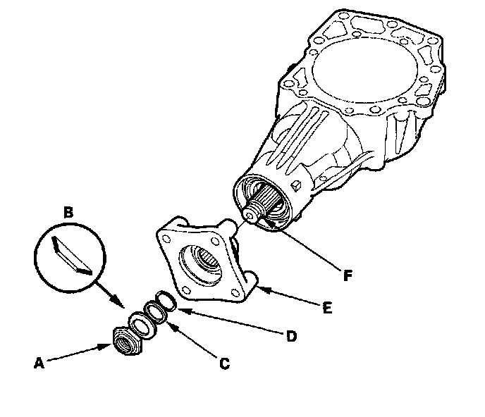 7. Remove the locknut (A), conical spring washer (B), back-up ring (C), O-ring (D), and companion flange (E) from the transfer driven gear shaft (F).