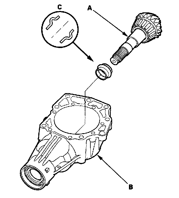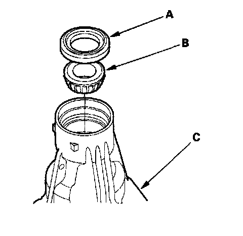9. Remove the oil seal (A) and tapered roller bearing (B) from the transfer housing (C).
