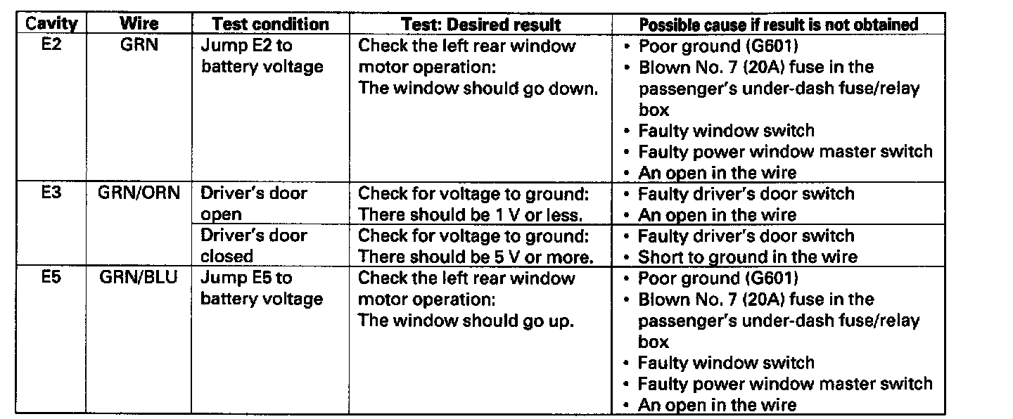 5. Reconnect the driver's multiplex control unit to the driver's under-dash fuse/relay box, turn the ignition switch ON (II), and perform the following input tests at the appropriate connectors on the back of the driver's under-dash fuse/relay box.