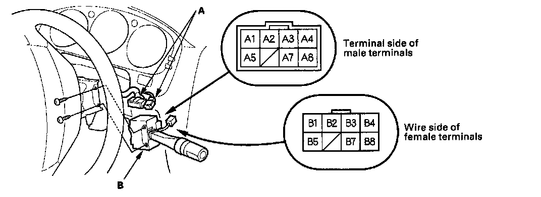 3. Disconnect the 8P connectors (A) from the wiper/washer switch (B), then remove the two screws and the switch.