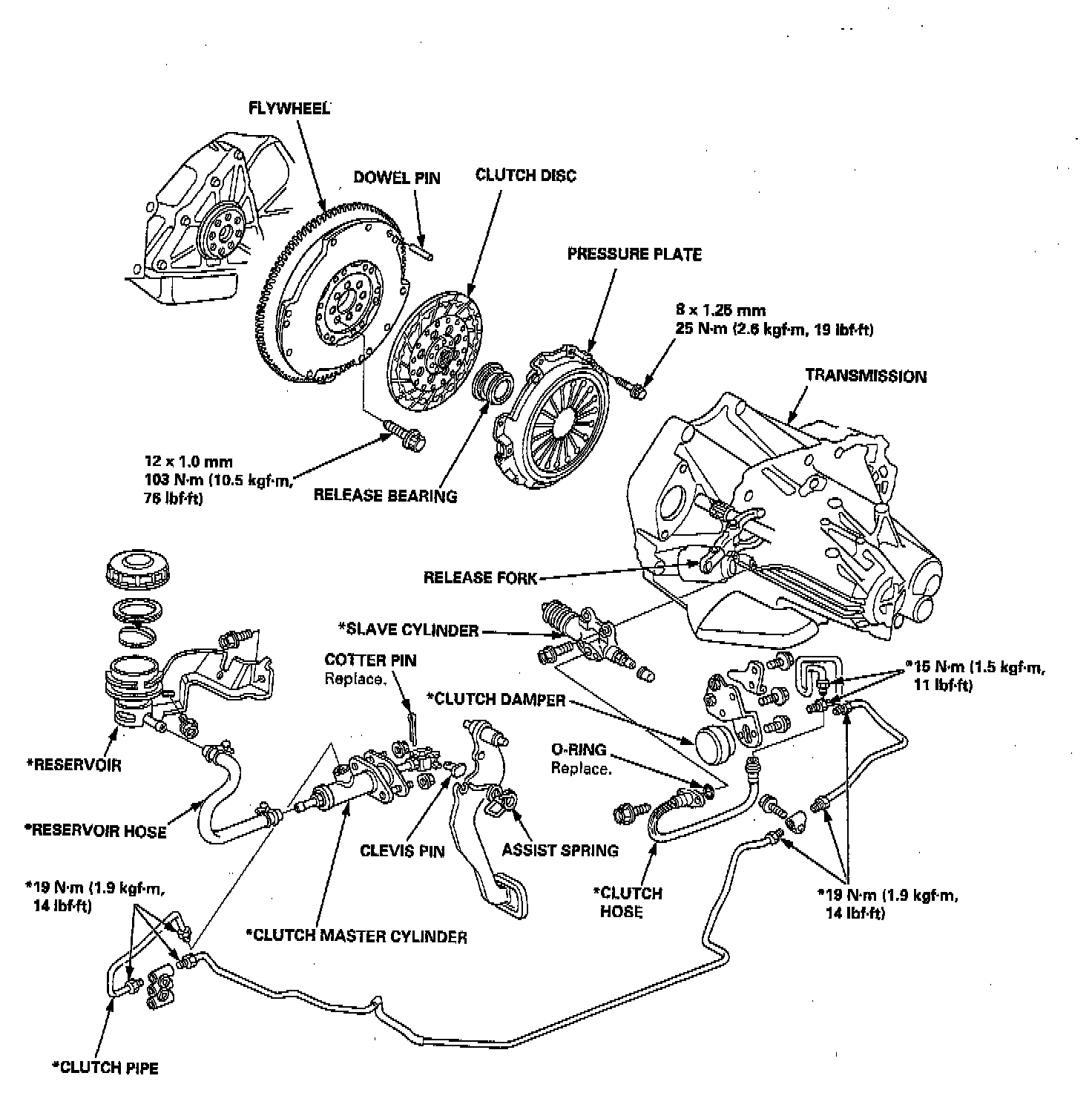 - If the parts marked * are removed, the clutch hydraulic system must be bled.