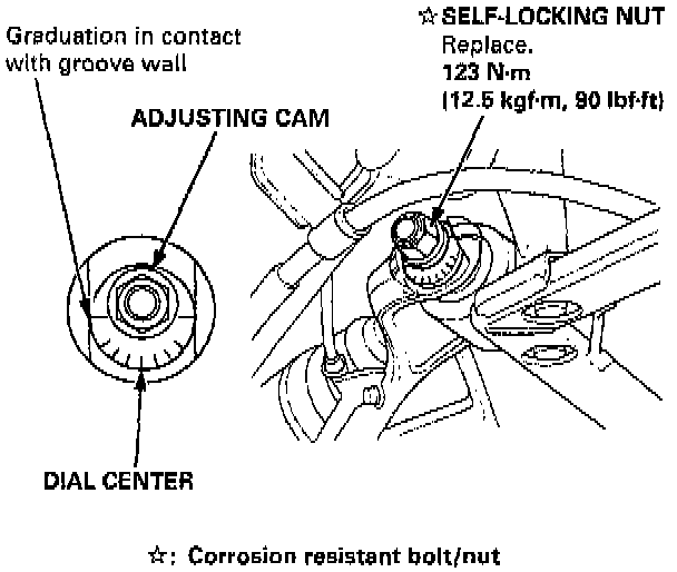 (1) Loosen the self-locking nut on the rear lower control arm adjusting point, then adjust the cam position so that the right and left graduations on the adjusting cam are in contact with groove wall.