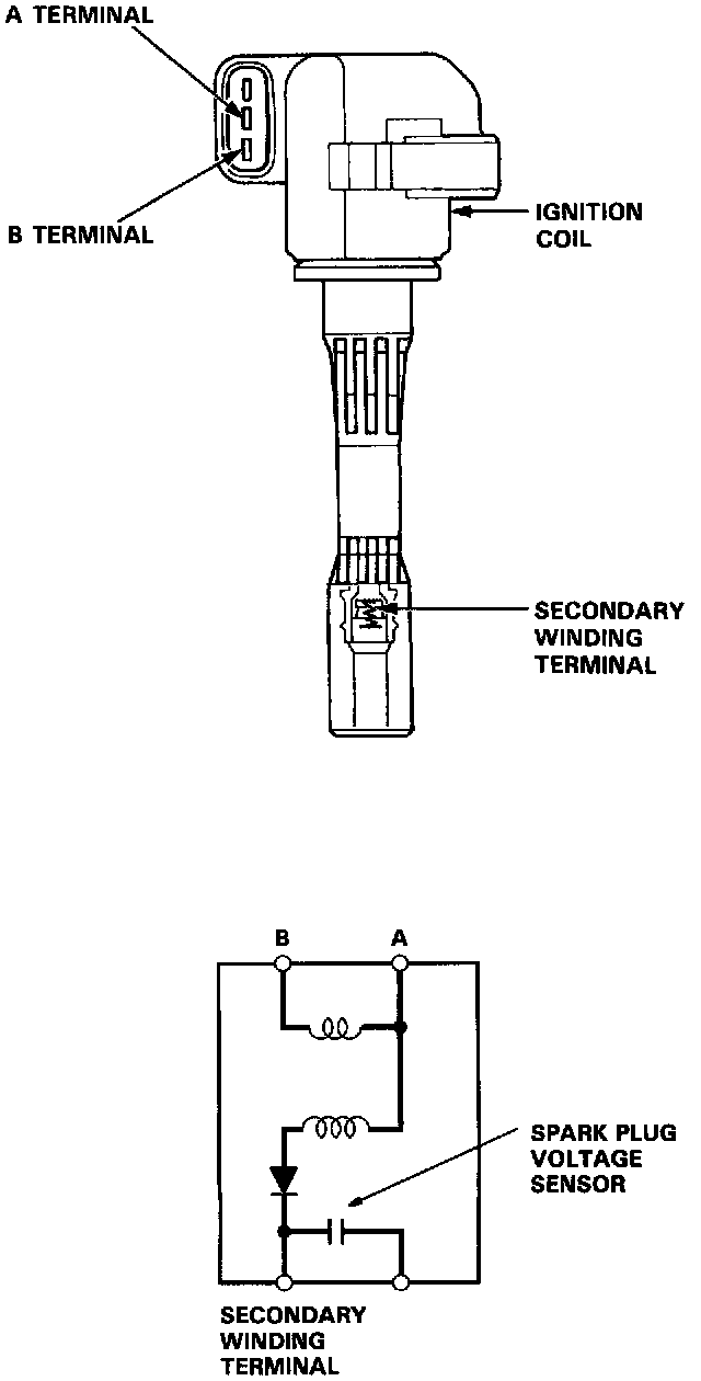 1. With the ignition switch OFF, remove the ignition coil.2. Using an ohmmeter, measure resistance between the terminals. Replace the coil if the resistance is not within specifications.