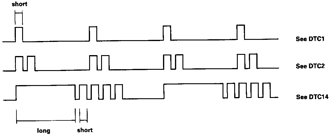 Codes 1 through 9 are indicated by individual short blinks, codes 10 through 20 are indicated by a series of long and short blinks. One long blink equals 10 short blinks. Add the long and short blinks together to determine the code. After determining the code, refer to Diagnosis by Symptom. Symptom Related Diagnostic Procedures