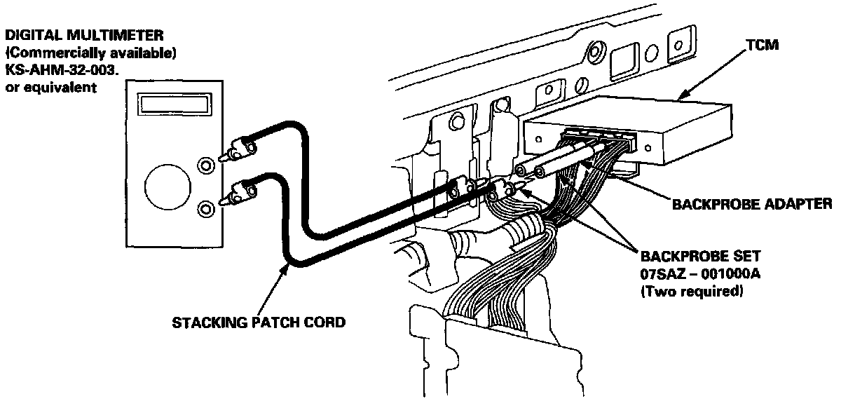 5. Inspect the circuit on the TCM according to the troubleshooting flowchart with the special tools and a digital multimeter as shown.