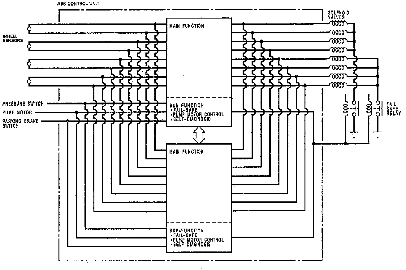 The ABS control unit consists of a main function section, which controls the operation of anti-lock brake system, and subfunction, which controls the pump motor and "self-diagnosis."