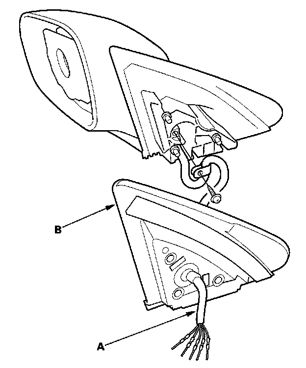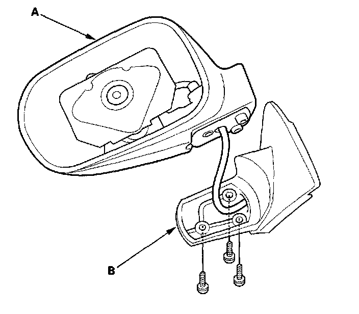 6. Remove the three screws, and separate the mirror housing (A) from the bracket (B).