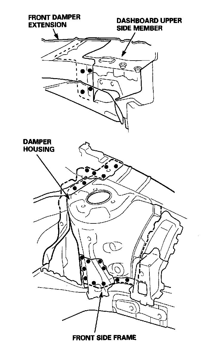 - From the passenger's compartment side, plug weld the holes in the dashboard lower, front damper extension and damper housing extension.