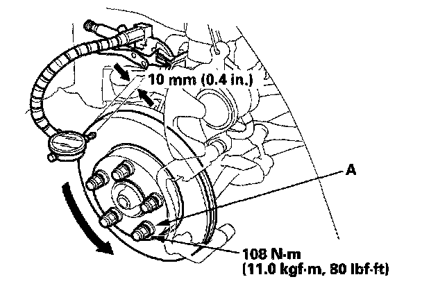 4. Install suitable flat washers (A) and wheel nuts, and tighten the nuts to the specified torque to hold the brake disc securely against the hub.