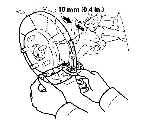 5. Set up the dial gauge against the brake disc as shown, and measure the runout at 10 mm (0.4 inch) from the outer edge of the disc.