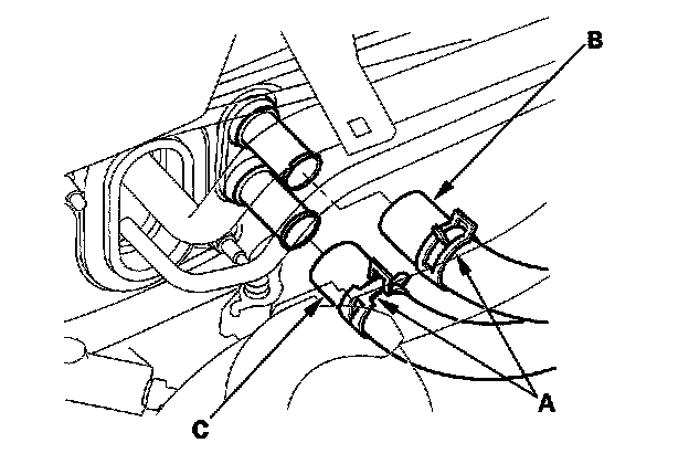 6. Slide the hose clamps (A) back, then disconnect the inlet heater hose (B) and the outlet heater hose (C) from the heater core. Engine coolant will run out when the hoses are disconnected; drain it into a clean drip pan. Be sure not to let coolant spill on the electrical parts or the painted surfaces. If any coolant spills, rinse it off immediately.