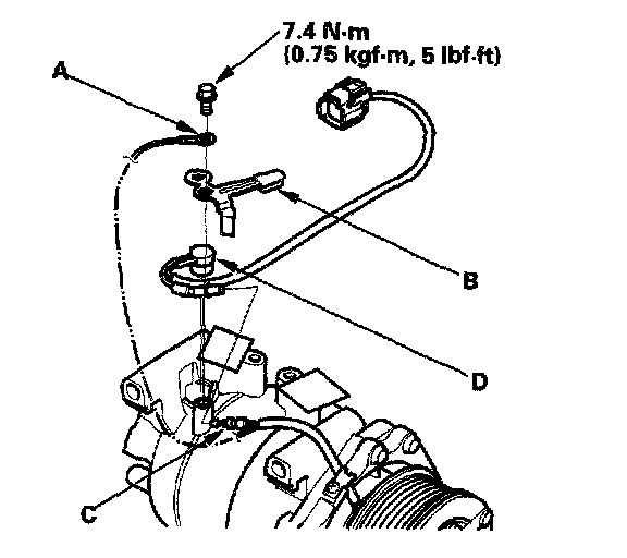 Compressor Thermal Protector Replacement1. Remove the bolt, the ground terminal (A), and the holder (B). Disconnect the field coil connector (C), then remove the thermal protector (D).