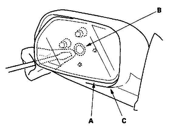 Mirror Holder Replacement1. Pry the mirror holder (A) out from the bottom until you can see the pivot (B) of the actuator, then detach the pivot using a flat-tip screwdriver wrapped with a shop towel. Take care not to scratch the mirror (C).
