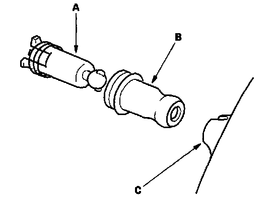 3. Remove the actuator shafts (A) and rubber boots (B) from the old mirror holder (C). Check the actuator shaft and rubber boot for damage or deterioration, and replace them if necessary.