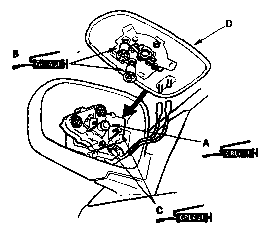 - Grease the pivot (A), actuator shafts (B), and mirror position sensor pins (C).