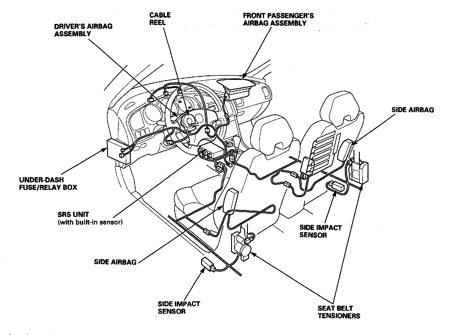 Supplemental Restraint System (SRS)This model has an SRS which includes a driver's airbag in the steering wheel hub, a passenger's airbag in the dashboard above the glove box, seat belt tensioners in the front seat belt retractors, side airbags in the front seatbacks,and side curtain airbags in the side of the roof side. The SRS unit is separate from the airbag assembly and has built-in sensors. The following precautions should be observed when performing sheet meal work, paint work, and repair work around the locations of the SRS component