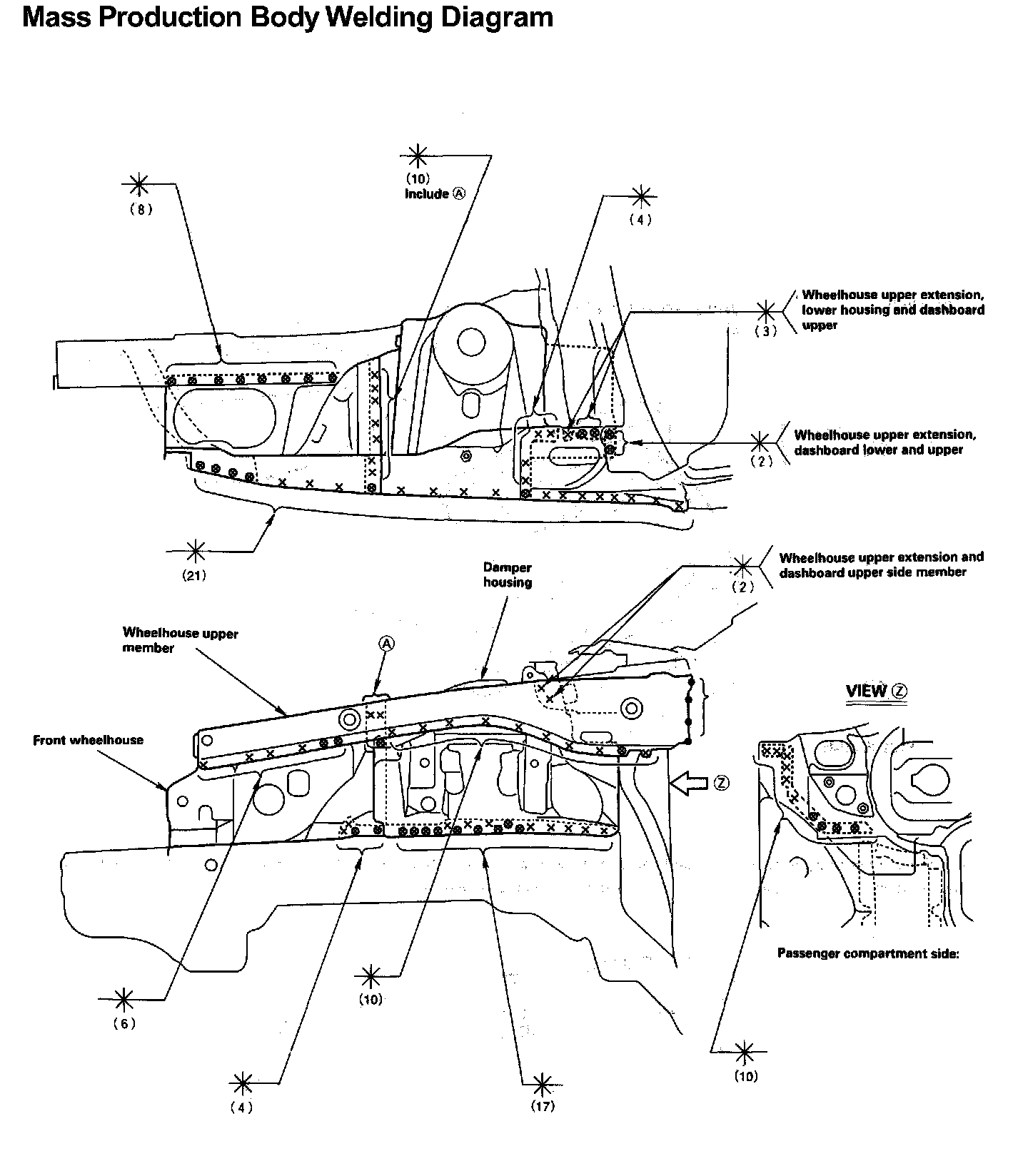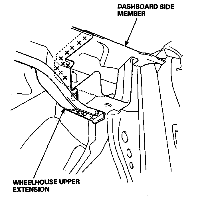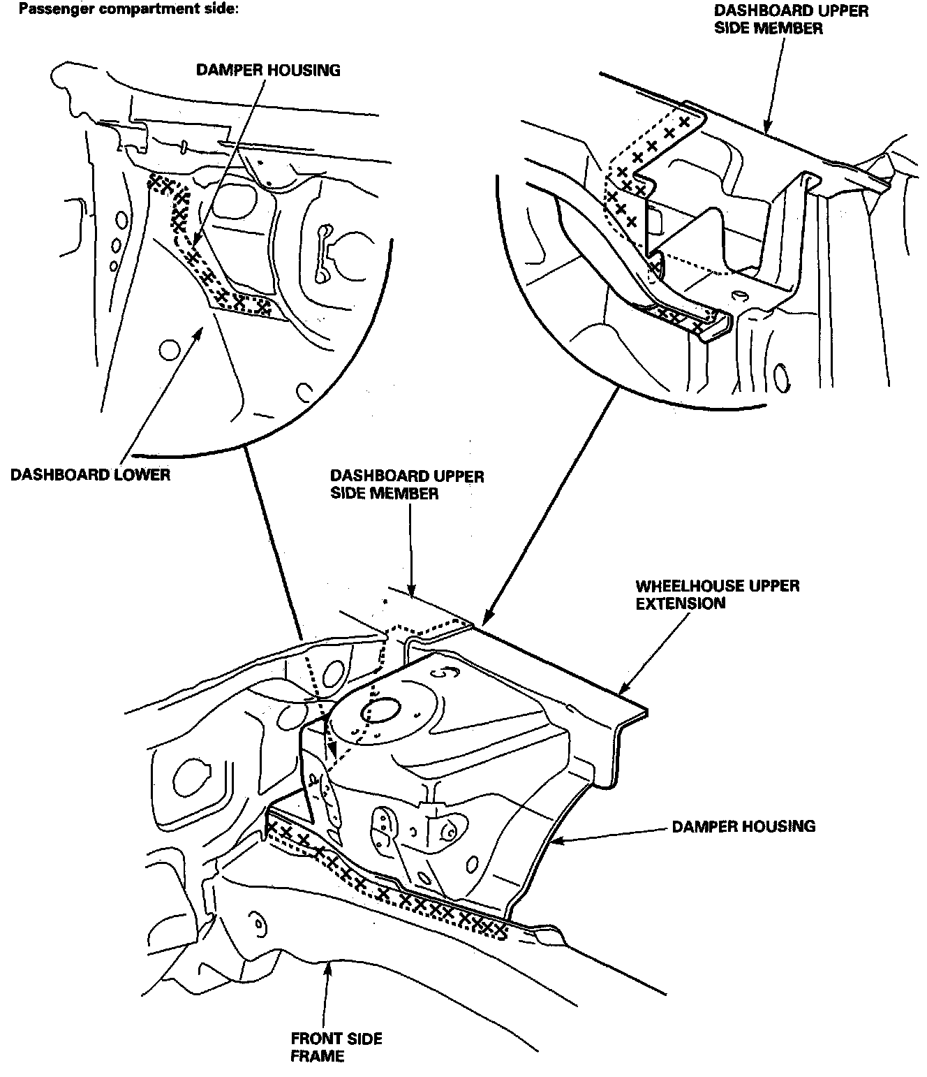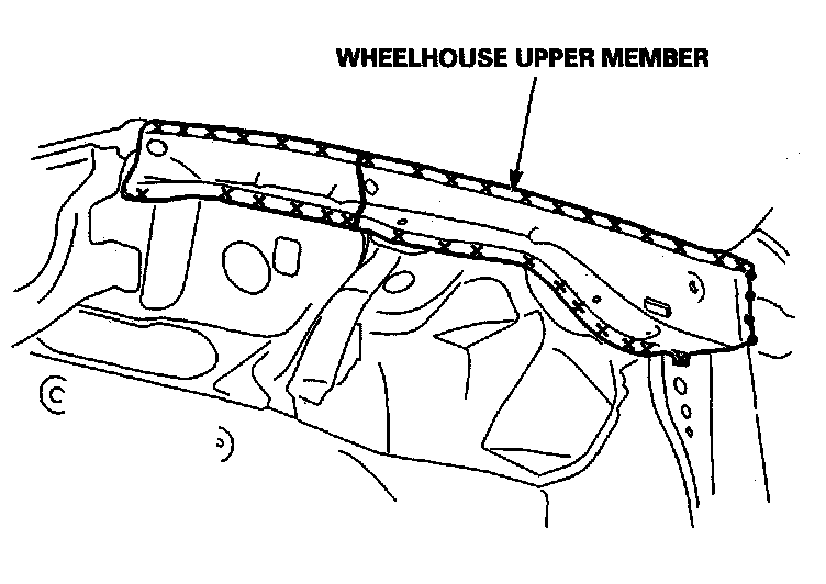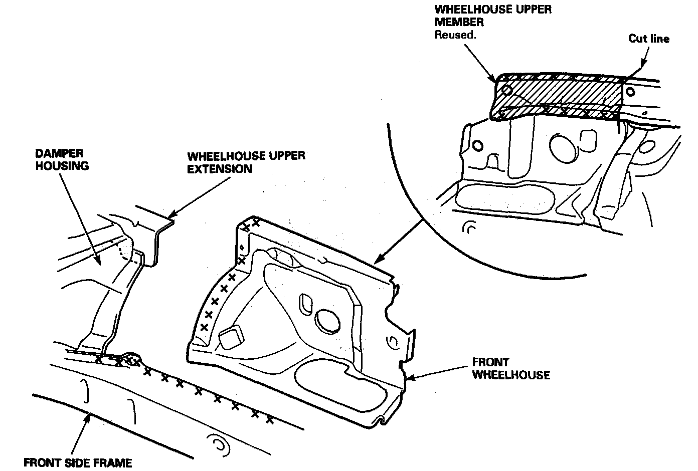 - Check the damper housing for position and damage. If necessary, remove the wheelhouse upper member, and replace the damper housing. Carefully remove the wheelhouse upper member so it can be reused.