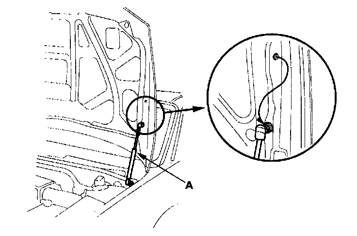 1. Remove the support struts (A) from the engine hood. Move the hood to a vertical position, then reinstall the support strut as shown.