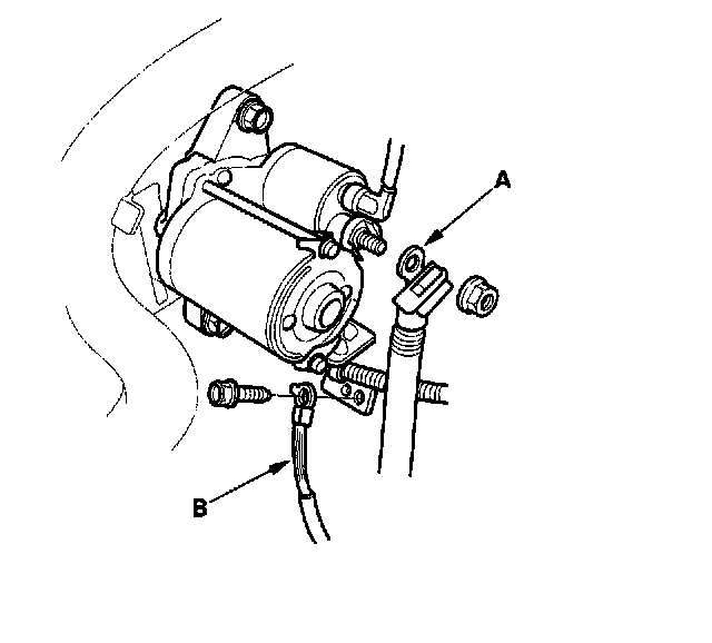 11. Remove the starter cable (A) and ground cable (B).