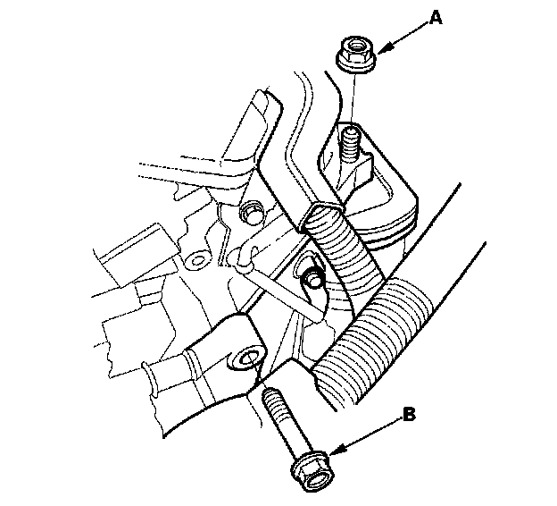 51. Remove the rear mount bracket support nut (A) and mounting bolt (B) (A/T).