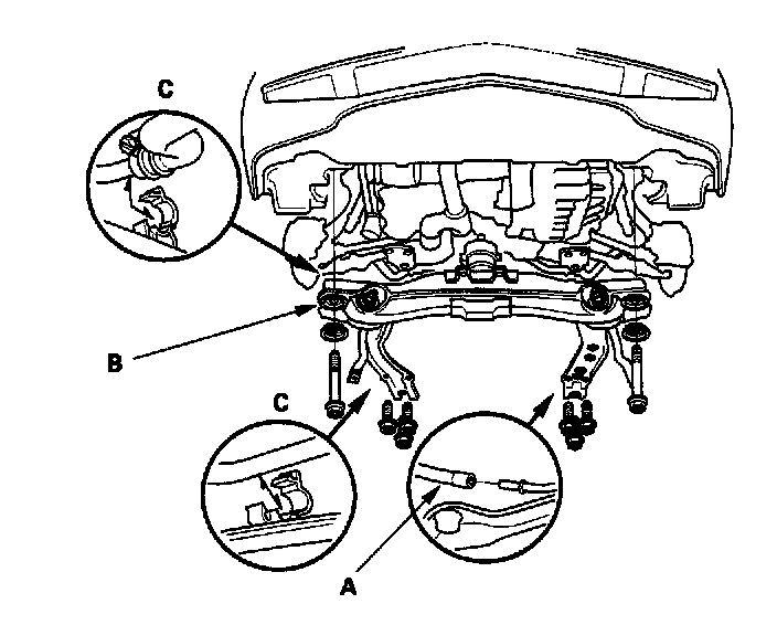 58. Disconnect the vacuum hose (A) on the front beam (B), and unlatch the P/S line clamps (C) on the front beam.