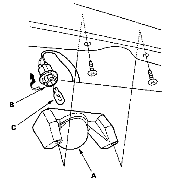 3. Turn the bulb socket (B) 45 ° counterclockwise to remove it from the light, then remove the bulb (C).