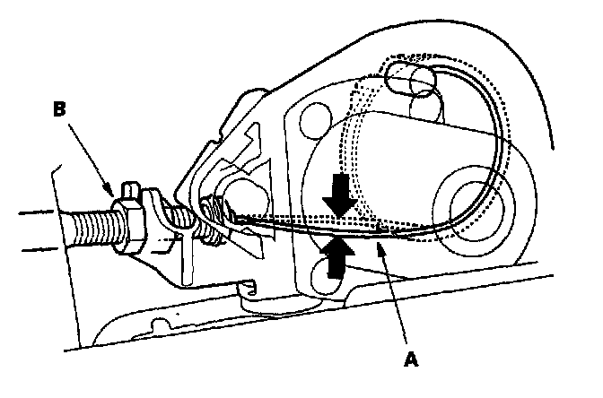 3 ± 2 mm (1/8 ± 1/16 in.) If the cable free play is out of specification, loosen the lock nut (B), then adjust the free play.