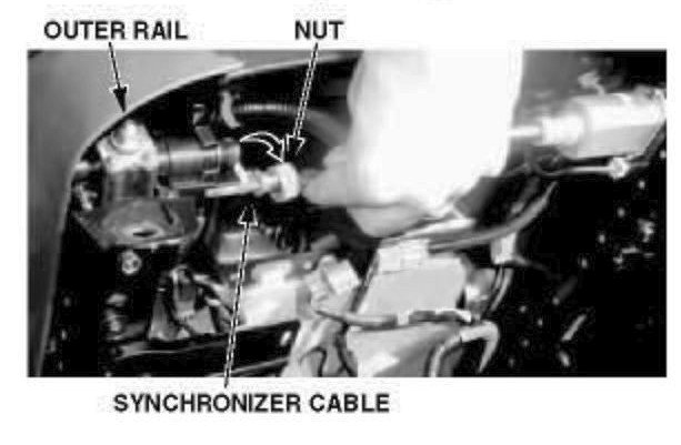 4. Loosen the nuts, and remove the synchronizer cable from the slave (outer rail) side of the seat.