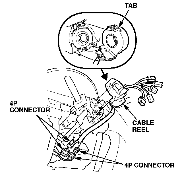 2002-03 3.2TL and 2003 3.2CL models: Unplug the SRS main harness 4P connector and the dashboard wire harness 4P connector from the cable reel 4P connectors. Release the tab, and then remove the cable reel from the column.