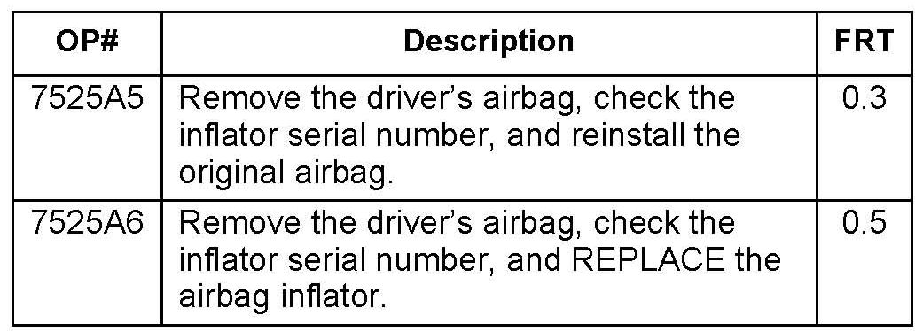 ^ All the vehicles involved in this campaign require inspection. However, only a very small number of these vehicles require replacement of the airbag inflator compared to the large number of vehicles that will require an inspection. Order an airbag inflator kit only if the inspection shows that the inflator must be replaced.