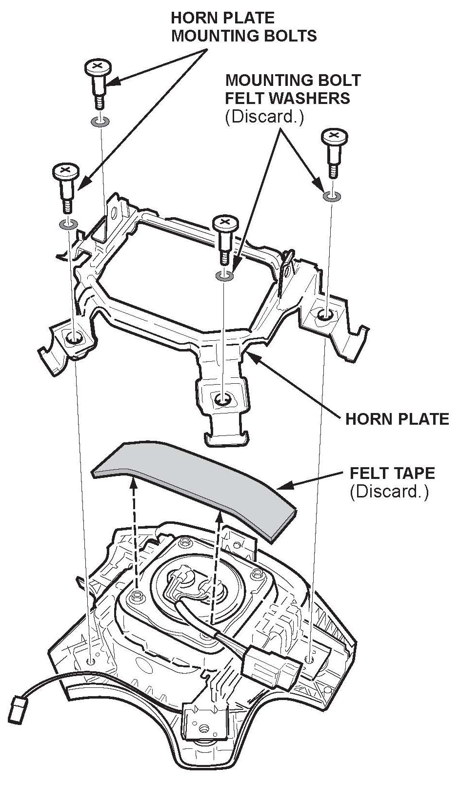 10. Reinstall the horn plate with new felt washers on its mounting bolts. Torque the mounting bolts to 3.4 N.m (2.5 lb-ft, 30 lb-in), then make sure the horn plate moves freely.