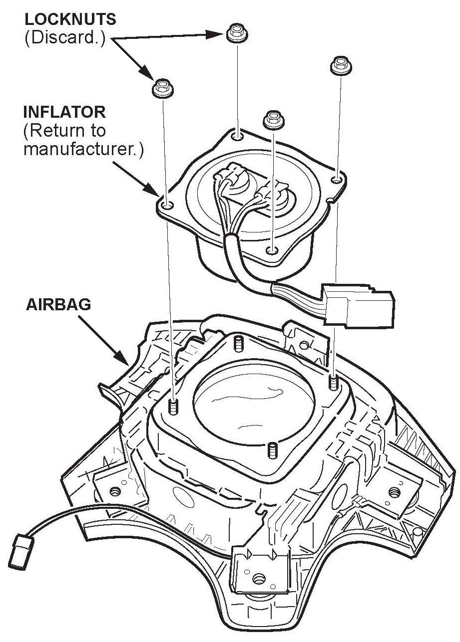 8. Install the new inflator in the airbag with new locknuts. Torque the locknuts to 3.9 N.m (2.8 lb-ft, 34 lb-in).