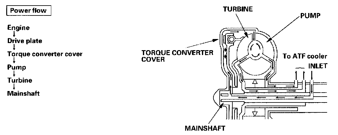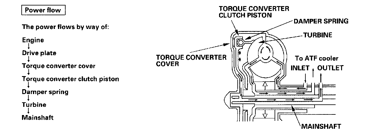 Fluid entered from the chamber between the torque converter cover and the torque converter clutch piston passes through the torque converter and goes out from the chambers between the turbine and the stator, and between the pump and the stator. As a result, the torque converter clutch piston moves away from the torque converter cover, and the torque converter clutch lock-up is released; torque converter clutch lock-up OFF.