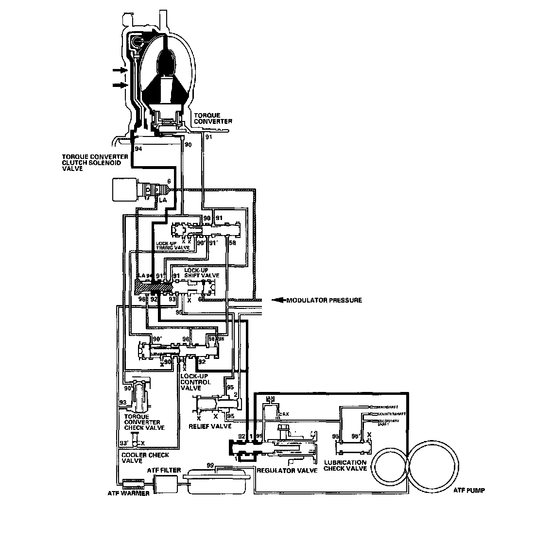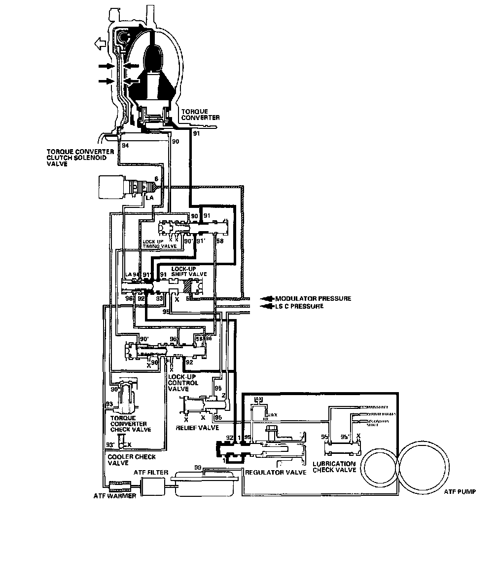 The torque converter clutch solenoid valve is turned OFF by the PCM. The lock-up shift valve receives LC pressure (LA) on the left side, and modulator pressure (6) on the right side. The lock-up shin valve is in the right side to uncover the port leading torque converter pressure (92) to the led side of the torque converter. Torque converter pressure (92) becomes torque converter pressure (94), and enters into the led side of the torque converter to disengage the lock-up clutch. The lock-up clutch is OFF.