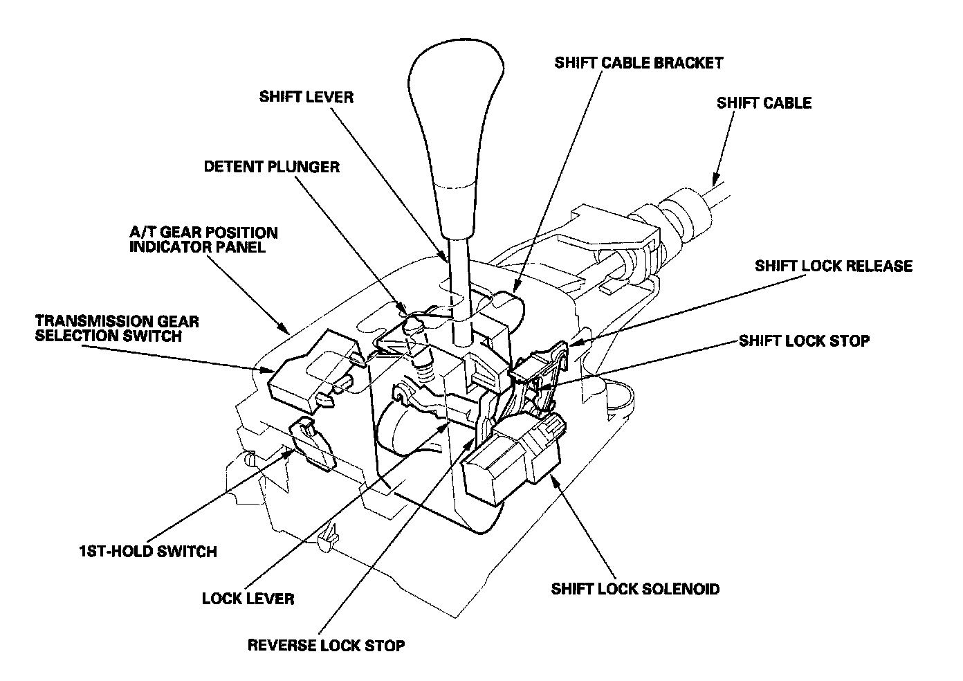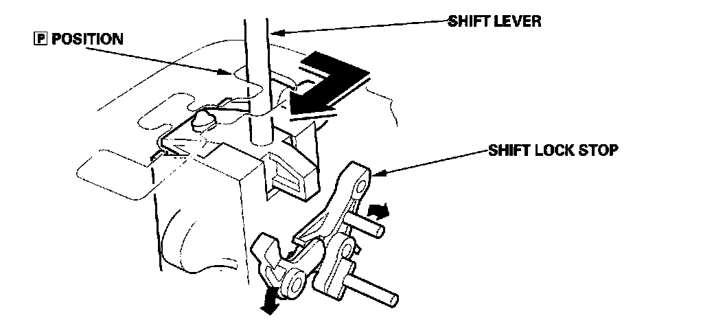 The shift lock mechanism consists of the shift lock solenoid, shift lock stop, shift lock release, and related parts. The reverse lock mechanism shares the shift lock solenoid with the shift lock mechanism. The reverse lock stop and the shift lock stop are interlocked with the shift lock solenoid operation. The shift lock solenoid is electronically controlled by these shift lock control system signals: brake pedal position switch signal, interlock control signal, and transmission range switch P position signal. If the shift lock solenoid does not operate, the shift lock/reverse lock mechanism can be released by pressing the shift lock release.