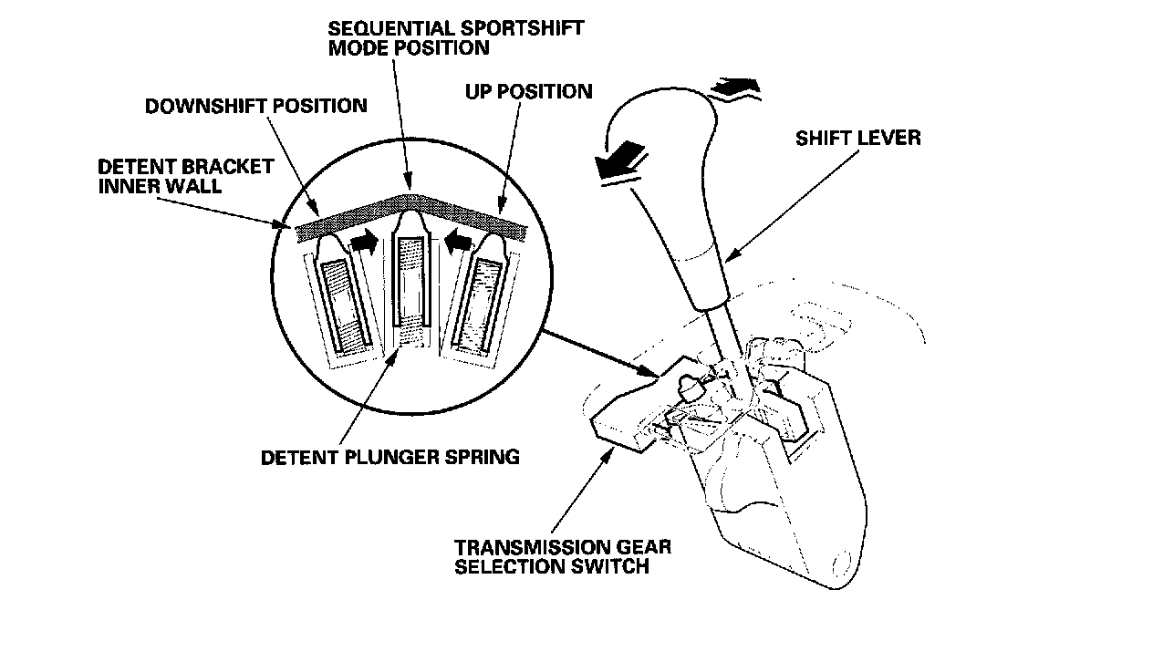 The shift lever fits into the sequential sportshift mode position by using a detent plunger with spring. When shifting up or down, the detent plunger is depressed by the detent bracket inner wall, and the detent plunger spring puts the shift lever back into the neutral position. The detent plunger also works in the P position.