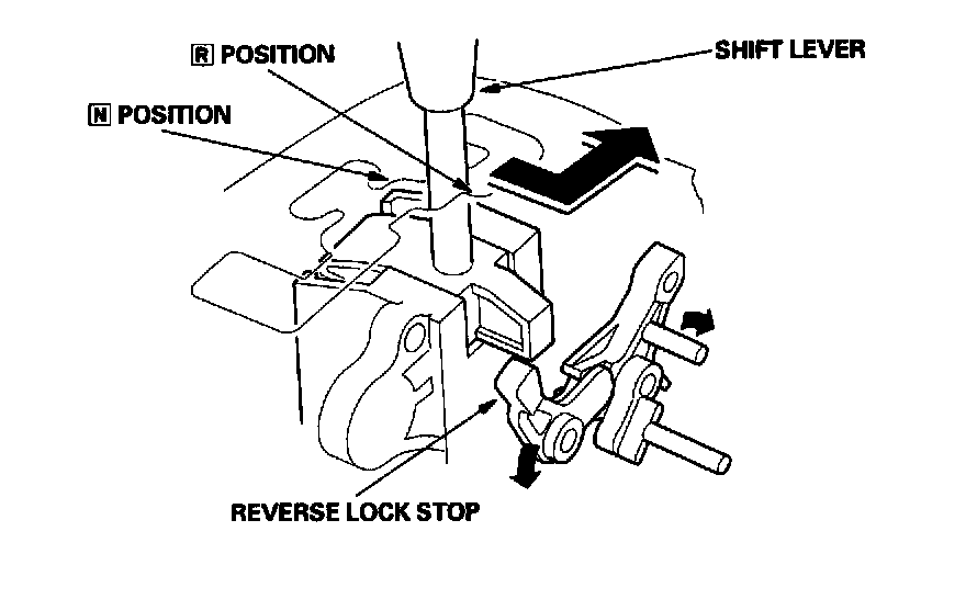 When the shift lever is shifted to the R position from the D5 position and the N position (under certain conditions), the shift lock solenoid is turned ON, and the shift lock solenoid plunger is retracted to release the reverse lock stop. This allows the shift lever to be moved to R position.