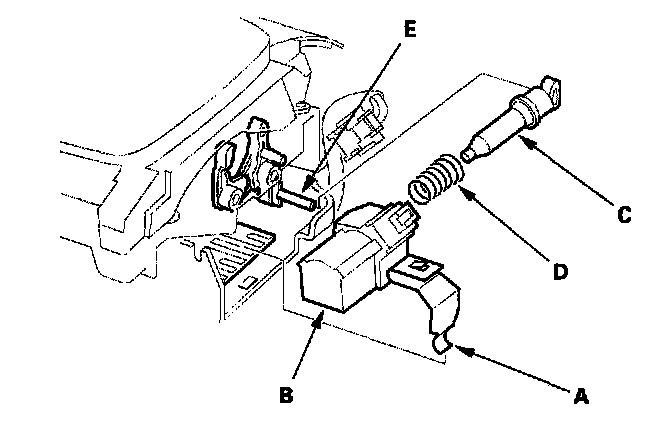 5. Install the shift lock solenoid by aligning the joint of the shift lock solenoid with the tip of the shift lock stop (E).