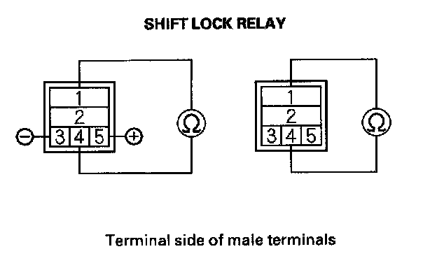 9. Check for continuity between the No. 1 and No. 4 terminals of the shift lock relay while connecting the battery positive terminal to the No. 5 terminal of the shift lock relay, and connecting the negative terminal to the No. 3 terminal.