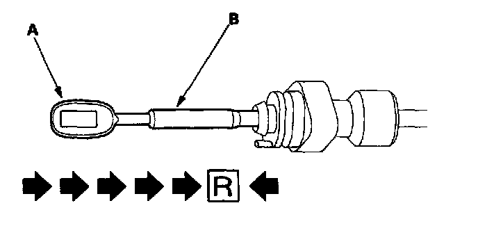 18. If necessary, push the shift cable (A) until it stops, then release your hand. Pull the shift cable back one step so that the shift position is in R. Do not hold the shift cable guide (B) to push and pull the shift cable.
