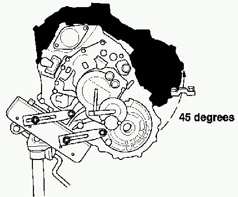 3. With the transmission attached to the special tool and the transmission jack rotated down to a 45 degree angle, raise the transmission up to engine level. Then rotate the rear of the transmission to align the dowel pins.