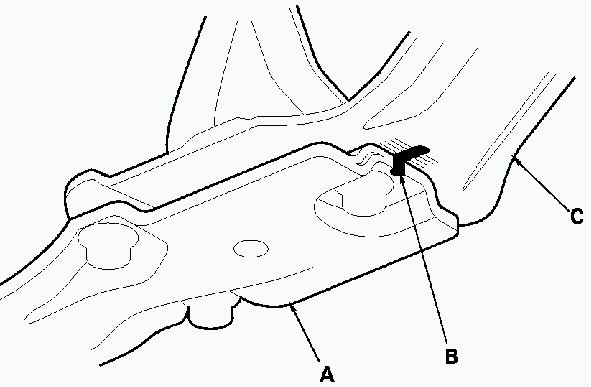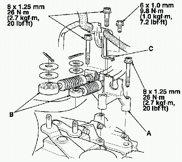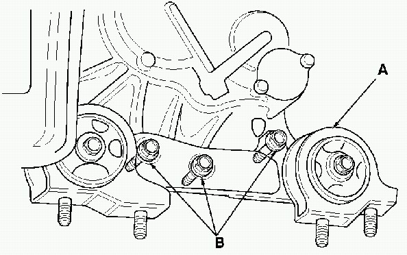 7. Remove the special tool, then install the transmission side mount (A) to the transmission, then loosely tighten the three bolts (B).