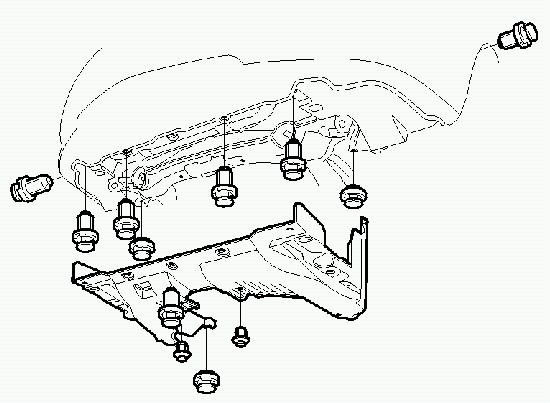 9. Install the transmission lower mount nuts (E) and tighten them tot he specified torque.