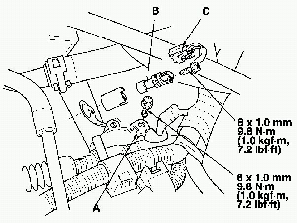 21. Install the ground cable (A), and CKP sensor B (B), then connect the CKP sensor B connector (C).